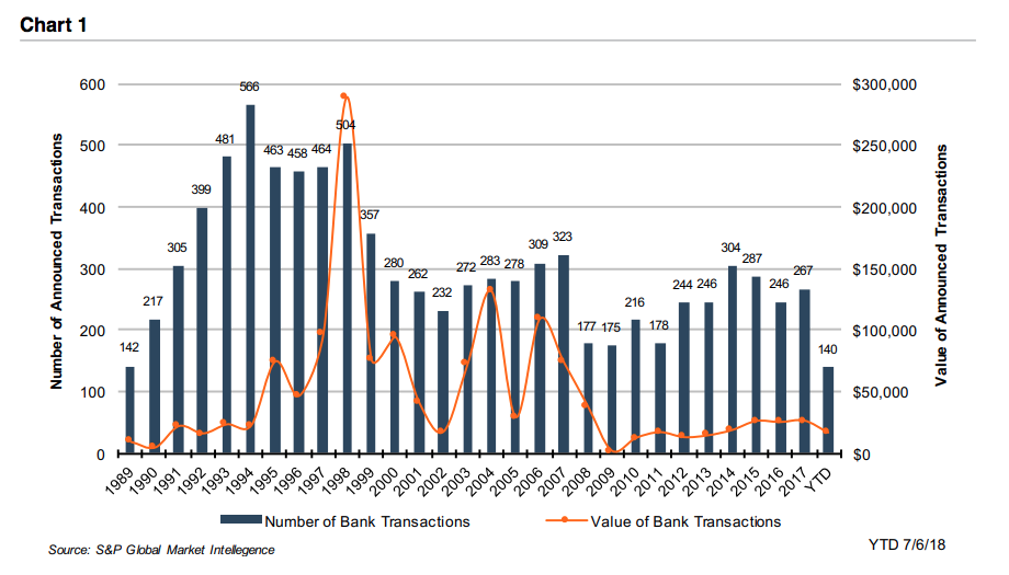 There were 140 announced transactions according to S&P Global Market Intelligence through early July, which equates to 2.4% of 5,913 FDIC-insured institutions that existed as of year-end 2017. The average assets per transaction based upon YTD activity was $656 million, which is below the 28 year average of $1.1 billion.