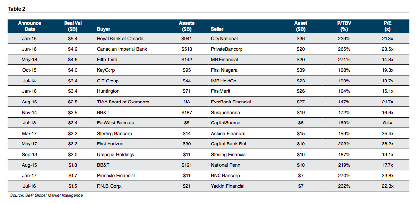 Lower tax rates notwithstanding, it appears that buyers are still paying roughly 9-13x pro forma earnings assuming all expense savings are fully realized, a level of pricing that we believe has existed for many years excluding periods when industry fundamentals are stressed. For example, Fifth Third Bancorp (FITB) estimates the $4.6 billion consideration to be paid to MB Financial (MBFI) shareholders equates to 16.4x consensus 2019 earnings and 9.6x assuming all expense savings realized in 2019 (which will not be the case due to the phase-in lag).