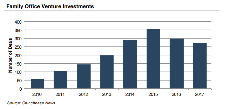 An analysis from Crunchbase News shows the progression of family office venture investment over the last few years. While this is a small sample, it helps demonstrate the growing trend. Crunchbase also notes several prominent family venture-backed exits including Twilio, Okta, Bitly, and Workday.