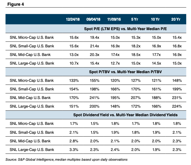 Although there is no change in the driver of consolidation such as succession issues, shareholder liquidity needs, and economies of scale, a slowdown in M&A activity in 2019 is likely because bank stocks will enter the year depressed. Deals that entail some amount of common share consideration will be tough to structure unless sellers will be willing to take less, which most will not do with operating fundamentals in good shape for now. All cash deals will be impacted less, but all cash deals are more prevalent among very small institutions in which pricing usually occurs at a discount to those that entail some proportion of common shares.