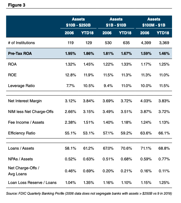 Bank fundamentals are in good-to-great shape. During the third quarter all FDI-Cinsured institutions reported aggregate net income of $62 billion, up 29.3% from 3Q17. Excluding the impact of lower taxes, 3Q18 pro forma net income would have been about $55 billion, up 13.9% from 3Q17. The data is more nuanced once the industry is segregated by asset size, however.