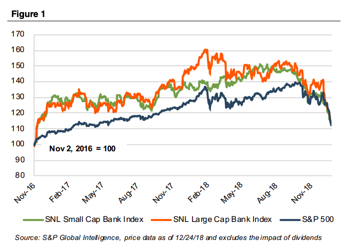 As 2018 draws to a close, bank fundamentals are very good; however, bank stock prices have tanked. SNL Financial’s small-, mid-, and large-cap bank indices have fallen by more than 20% since August 31, which meets the threshold definition of a bear market (i.e., down 20% vs. 10% for a correction).