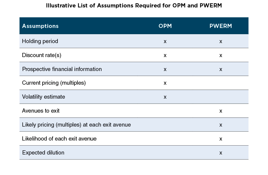 When an exit event is not imminent, the appropriate models to measure the fair value of a company with a complex capital stack are the Probability Weighted Expected Return Method (PWERM), the Option Pricing Method (OPM), or some combination of the two. While the choice of the model(s) is often dictated by facts and circumstances – for example, the company’s stage of development, visibility into exit avenues, etc. – using either the PWERM or the OPM requires a number of key assumptions that may be difficult to source or support for pre-public, often pre-profitable, companies. In this context, primary or secondary transactions involving the company’s equity instruments, which may or may not be identical to common shares, can be useful in measuring fair value or evaluating overall reasonableness of valuation conclusions.