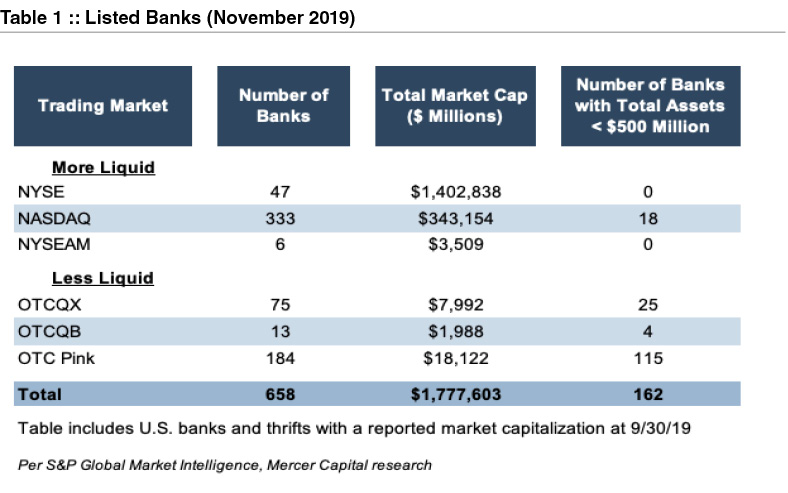 Bank analysts are awash in data, both regarding banks’ financial performance but also market data regarding publicly traded banks’ valuation. Table 1 presents a breakdown by trading market of the number of listed banks in November 2019.