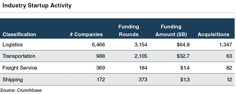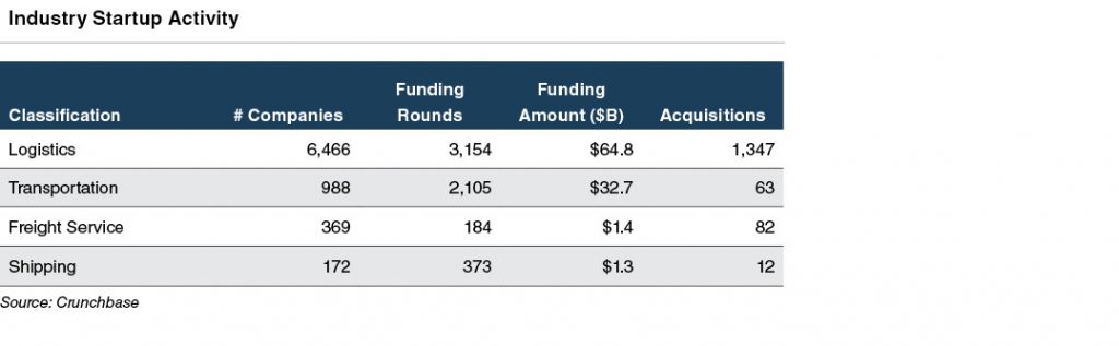 The classification of transportation and logistics startups differs, but it is clear that there is growing innovation in many different facets of the industry. It is evident that technological change in the freight transportation industry is about far more than just digitizing processes that once involved paper or fax machines. The application of advanced data and analytics to the transportation and logistics industry has the potential to change the global movement of freight.