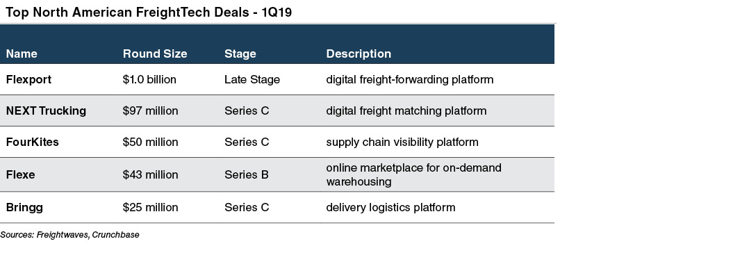 The willingness of industry participants to adopt logistics technology is evident as well. Corporate players and major OEMs have spun up innovation departments, startup accelerators, and investment arms in order to find and fund new technology. However, it’s not only the companies that directly benefit from this technology that are investing capital in the space. Technology players recognize the potential for returns on transportation investments, too. Alphabet’s venture capital arm, Capital G, led a $185 million investment in Convoy, a tech-enabled freight matching startup, at the end of 2018. The Series C round valued Convoy at $1.0 billion and brought the company’s total capital raise to $265 million. Softbank Vision Fund, known for making big bets on disruptive technology, got in on the game too. The fund invested $1.0 billion in Flexport, a digital platform for freight forwarding and logistics, at the start of the year. The investment valued the company at $3.2 billion. The table below shows the five largest North American FreightTech investments in the first quarter of 2019 by round size.