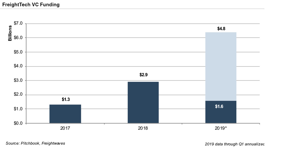 Over the past few years, FreightTech has emerged as its own category of technology. The level of excitement in the space grew in 2018 as global venture capital investment increased to $2.9 billion from $1.3 billion the prior year. FreightTech is on track for another year of exponential growth in 2019, with $1.6B of funding raised in the first quarter alone.