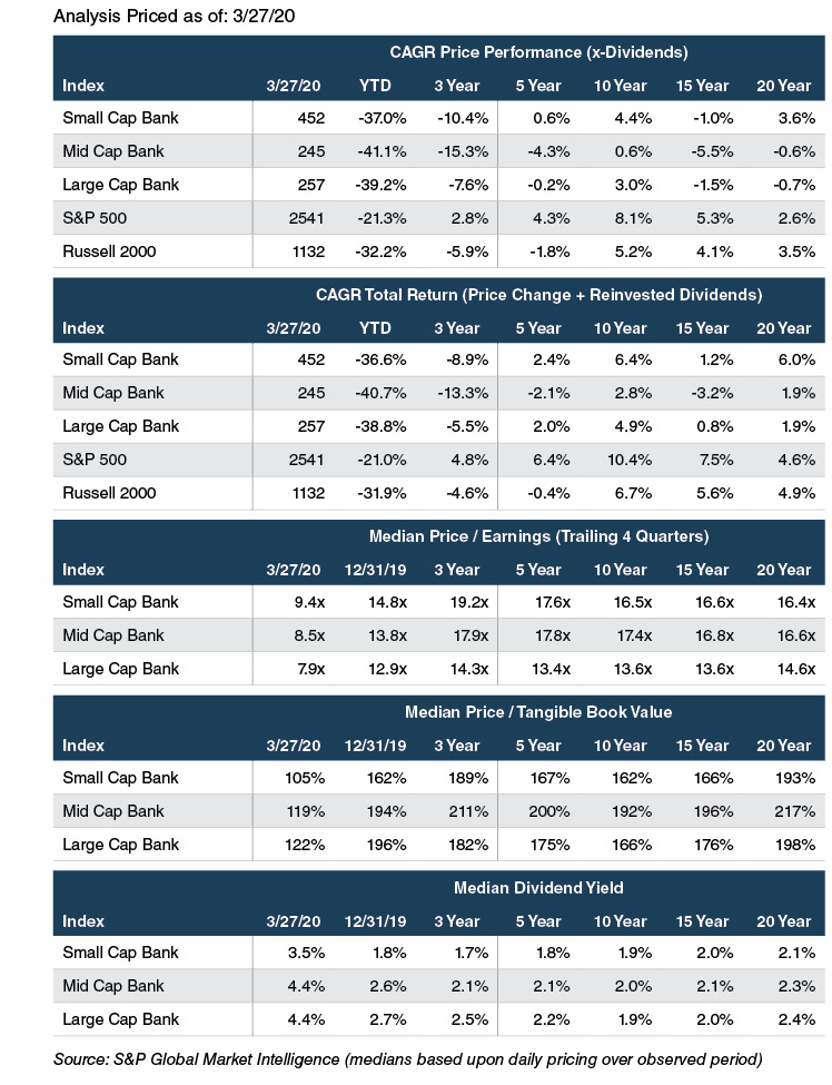 U.S. equity markets have entered a bear market, the definition of which is a drop of at least 20%.As of March 27, 2020, the S&P 500 had declined 21% year-to-date and the Russell 2000 was down 32%.Not surprisingly banks have fared worse with the SNL Large Cap Bank Index falling 39% given the implications for credit because of the government’s mandated shutdown of broad swaths of the economy due to COVID-19.