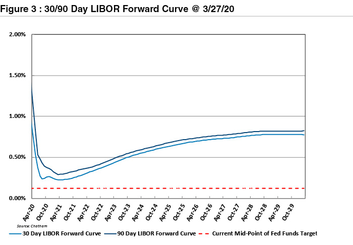 Perhaps one of the more depressing expectations for banks is not that credit losses will increase but the Fed promise that short-term rates will remain anchored near zero for the foreseeable future.As shown in Figure 3, the market expects 30/90 day LIBOR to fall from current distressed levels in excess of 1.0% to around 0.3% within a few months and remain anchored there for a couple of years.