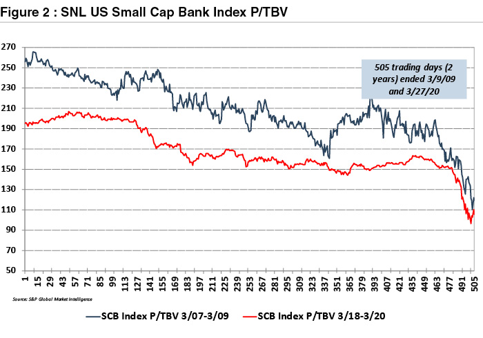 We do not know how much further bank stocks may fall if at all from late March in what we are taking liberty to define as GFC2.Figure 1 provides perspective on how banks—here defined as SNL’s Small Cap US Bank Index—performed in the two-year period ended March 9, 2009, and March 27, 2020. During GFC1 the bank index fell almost 70% to when the bear market ended. (March 9 was near the date when FASB eased mark-to-market rules and the Obama Administration signaled it would not nationalize the banks.)
