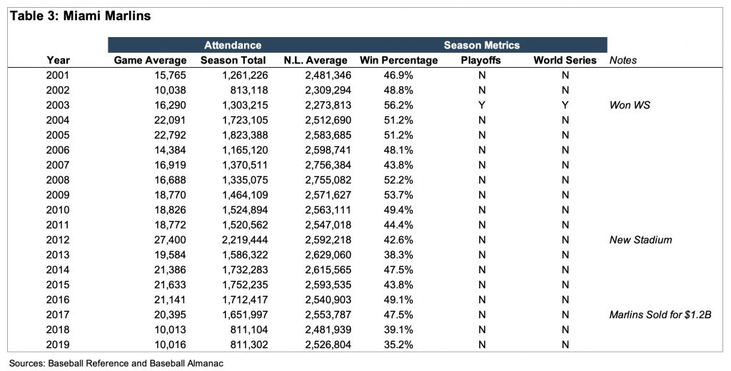 The Miami Marlins clearly represent the bottom tier of the MLB in many categories. They built a brand-new state of the art ballpark in 2012 and attendance averaged about 1.7 million from 2014 to 2017. In the fall of 2017, the Derek Jeter group bought the team. and the new owners quickly traded notable high-priced players to other teams, including the NY Yankees, in order to reduce their losses. The new ownership group was hoping to stabilize attendance near the 1.7 million mark, but instead dropped to 811,000 in both 2018 and 2019; 367,000 less than the next worst attendance in MLB, which was Tampa Bay, and about 500,000 less than the third worst team, the Baltimore Orioles. (SeeTable 3 for details)