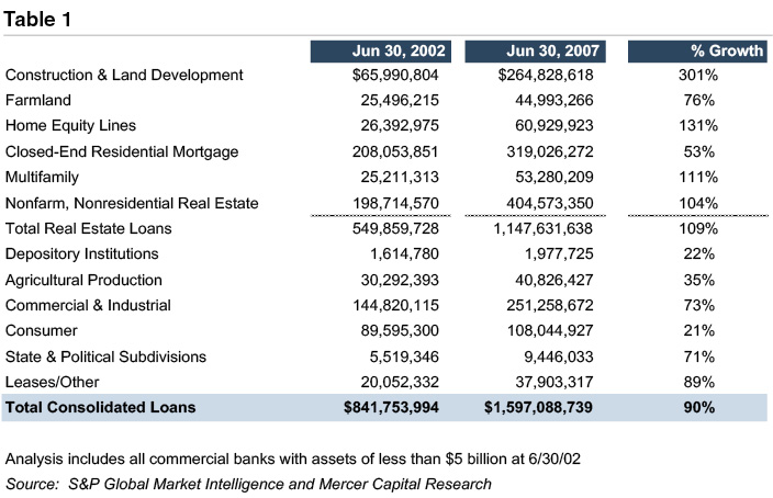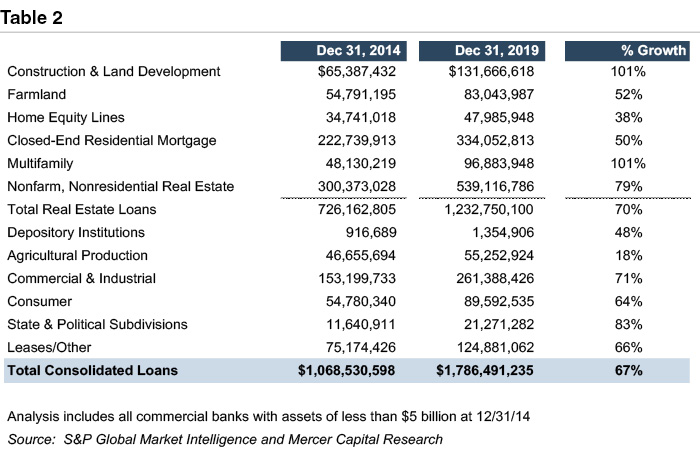 Table 1 presents aggregate loan balances for community banks at June 30, 2002 and June 30, 2007, the finalperiod prior to the Great Financial Crisis’ onset.One evident trend during this five year period is the grossly unbalanced growth in construction and development lending, which led to outsized losses in subsequent years.Have similar imbalances emerged more recently?