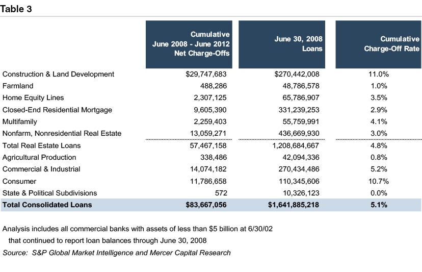 Using the same data set, we also calculated in Table 3 the cumulative loss rates realized between June 30, 2008 and June 30, 2012 relative to loans existing at June 30, 2008.