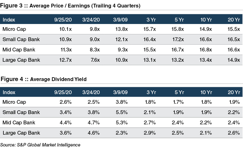 As shown in Figure 1, bank stocks have produced a negative total return that ranges from -27% for the twelve months ended September 25, 2020 for the SNL Large Cap Bank Index to -36% for the SNL Mid Cap Bank Index. At the other extreme are tech stocks. The NASDAQ Composite has produced a one-year total return of 35%–a 70% spread between the two sectors.