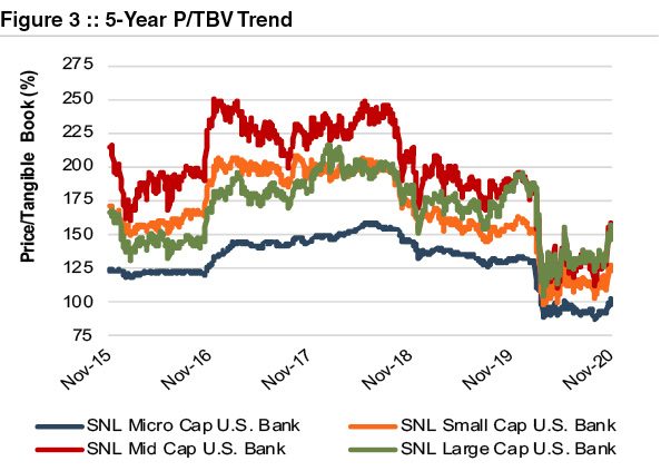 Bank stocks rallied in the first few weeks of November 2020 as the market’s Thanksgiving dinner came early, and it digested several issues including positive news on the COVID-19 vaccine candidates.While significant uncertainty still exists on credit conditions, COVID-19, and the economic outlook, bank valuations and earnings expectations also benefitted from the yield curve steepening as evidenced by the 10-year Treasury moving up from ~50 bps in early August to ~85 bps in mid-November.