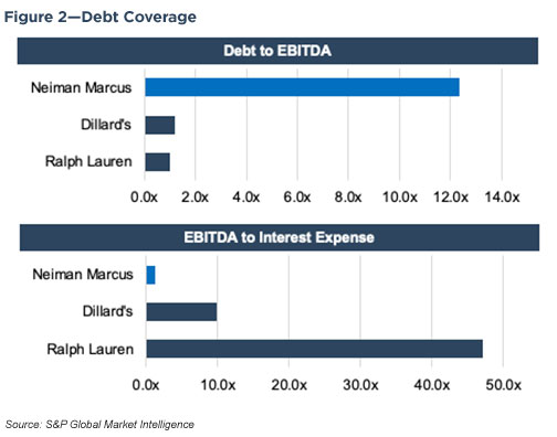 Neiman Marcus has struggled with a high debt load since the first LBO in 2005, which has been magnified by the disruptive impact that online retailing has had on department stores. EBITDA declined from $665 million in FY2015 to $400 million in the LTM period ended April 27, 2019; the EBITDA margin declined by over a third from 13.1% to 8.5%, over the same time. By April 2019, debt equated to 12.4x LTM EBITDA and covered interest expense by 1.2x. By way of reference, the debt/EBITDA and EBITDA/interest ratios for Ralph Lauren (NYSE: RL) for the fiscal year ended March 30, 2019, were 1.0x and 47.1x, while the respective ratios for Dillard’s (NYSE: DDS) were 1.2x and 9.9x for the fiscal year ended February 2, 2019.