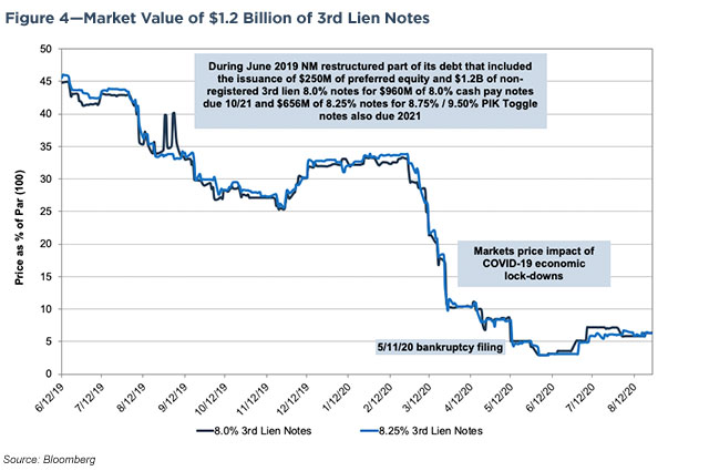 The restructuring did not (apparently) materially impact the Company’s $900 million asset-based credit facility of which $455 million was drawn as of April 2019; or the first lien $125 million debentures due in 2028. As shown in Figure 4, market participants assigned little value to the $1.2 billion of third lien notes that were trading for around 8% of par when the bankruptcy filing occurred and 6% of par in late August 2020. The binding Restructuring Support Agreement (“RSA”), dated May 7, 2020, included commitments from holders of 99% of the Company’s term loans, 100% of the second line notes, 70% of the third line notes, and 78% of the residual unsecured debentures to equitize their debt. Also, certain creditors agreed to backstop $675 million in debtor-in-possession (“DIP”) financing and to provide $750 million of exit financing which would be used to refinance the DIP facility and provide incremental liquidity. DIP financing is often critical to maintain operations during the bankruptcy process when the company has little cash on hand. DIP financing is typically secured by the assets of the company and can rank above the payment rights of existing secured lenders. DIPs often take the form of an asset-based loan, where the amount a company borrows is based on the liquidation value of the inventory, assuring that if the company is unable to restructure, the loan can be repaid from the liquidation of the retailer’s assets.