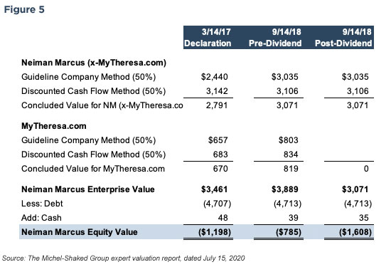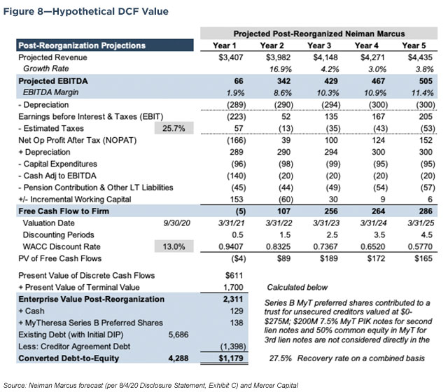 In the case of Neiman Marcus, the liquidation vs. reorganization valuation analysis was a formality because most unsecured creditors and the Company agreed to a prepackaged plan subject to resolution of such items as the MyTheresa shares. Nonetheless, we summarize both for illustration purposes.