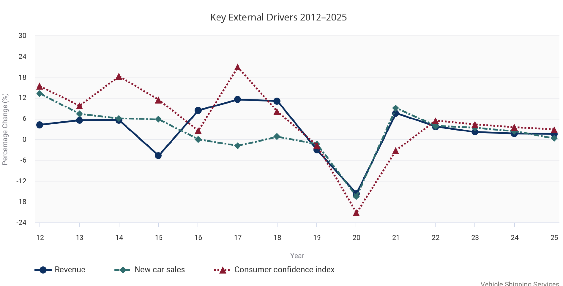 The industry’s growth prospects were halted during 2020 due to a high unemployment rate and a drop-off in disposable income. The success of the vehicle shipping services industry is closely intertwined with new car sales and consumer confidence. The graph below shows the relationship between revenue of the vehicle shipping services industry and new car sales and consumer confidence. Overall, decreased consumer confidence in 2020 led to many Americans electing to defer vehicle upgrades, which created a major economic downturn for the vehicle shipping services industry.