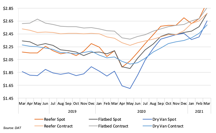 Even though contract rates did not have as sharp of a decline in March of 2020 as spot rates, both experienced a drop-off at the onset of the pandemic. Spot rates dropped below numbers that had been seen in recent years. After the sharp decline of spot rates in March, rates for all categories began to steadily increase. Rates hit a seasonal decline at the end of December due to decreased consumer spending after the holiday season. Rates resumed their climb during the first months of 2021. Overall, the rising price of contract and spot rates spins a positive image for overall outlook of the trucking industry, while also encouraging new competition to enter the market.