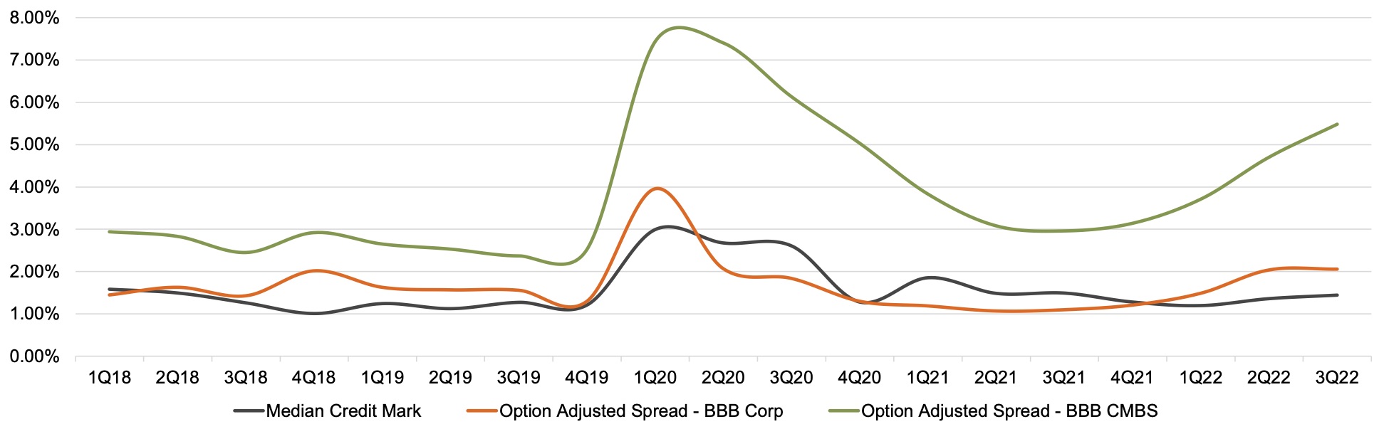 Figure 3 depicts the trend in the credit mark for our data sample relative to credit spreads. Credit spreads provide perspective on a number of factors, including where the credit cycle has been and where we may be headed.