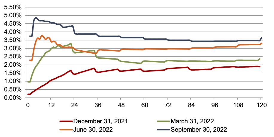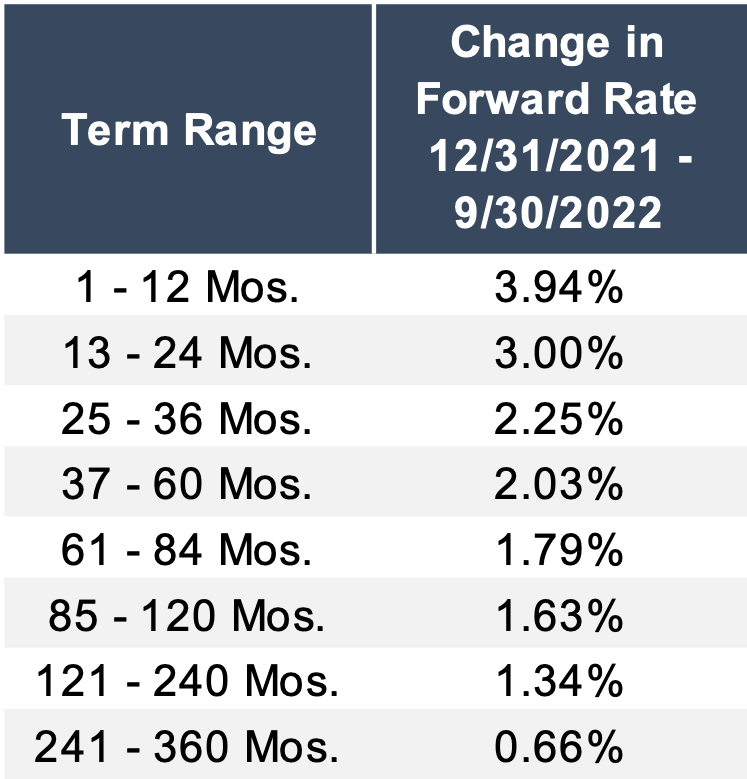 The shift in the valuation adjustment attributable to interest rates reflects an increase in market interest rates.Figure 2 depicts the LIBOR forward curve at December 31, 2021, March 31, 2022, June 30, 2022, and September 30, 2022.Relative to December 31, 2021, forward LIBOR rates have increased 66 bps to 394 bps on average with the largest increases occurring for periods ranging from 1 to 12 months following the valuation date.