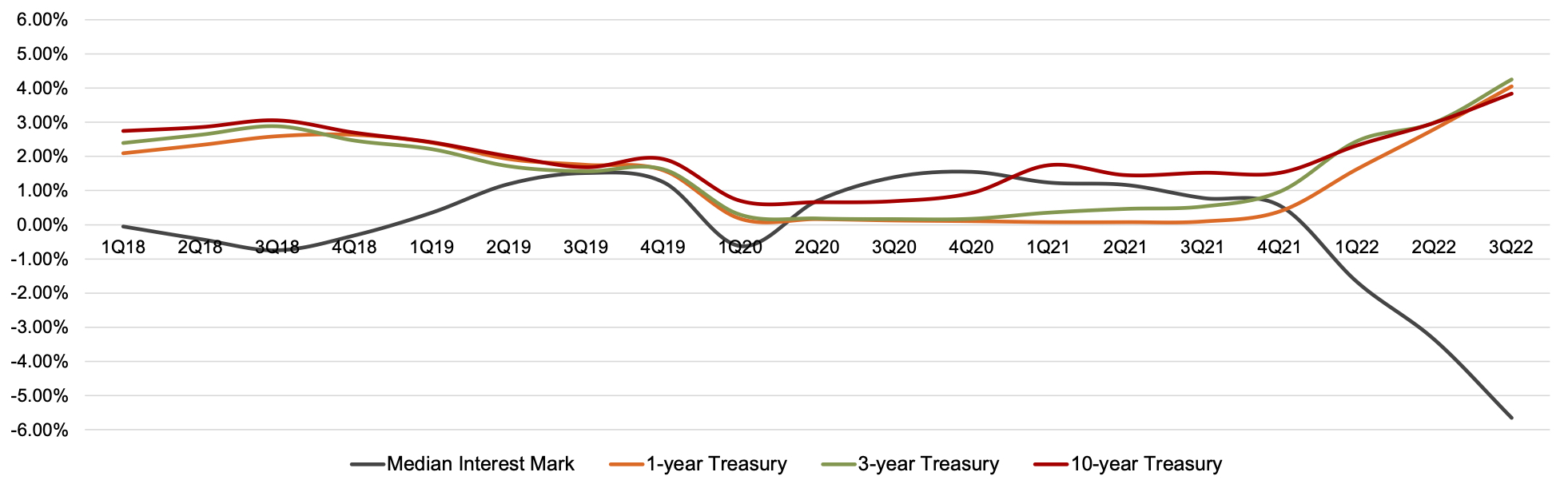 Since the end of 2021, rising market interest rates have been the predominant factor driving the change (i.e., reduction) in loan portfolio fair values. As shown in Figure 1, the median interest rate mark for our data sample has fallen from a modest 0.55% premium at December 31, 2021 to a 5.65% discount as of September 30, 2022. While bank earnings benefit from a higher rate environment and net interest margin expansion, it takes time for the increase in market rates to be passed on to customers via higher loan rates and for lower, fixed-rate loans to roll out of the portfolio. In talking with Mercer Capital clients and in our loan portfolio valuation practice, so far it seems that banks have been unable to fully pass on the increase in rates to loan customers.
