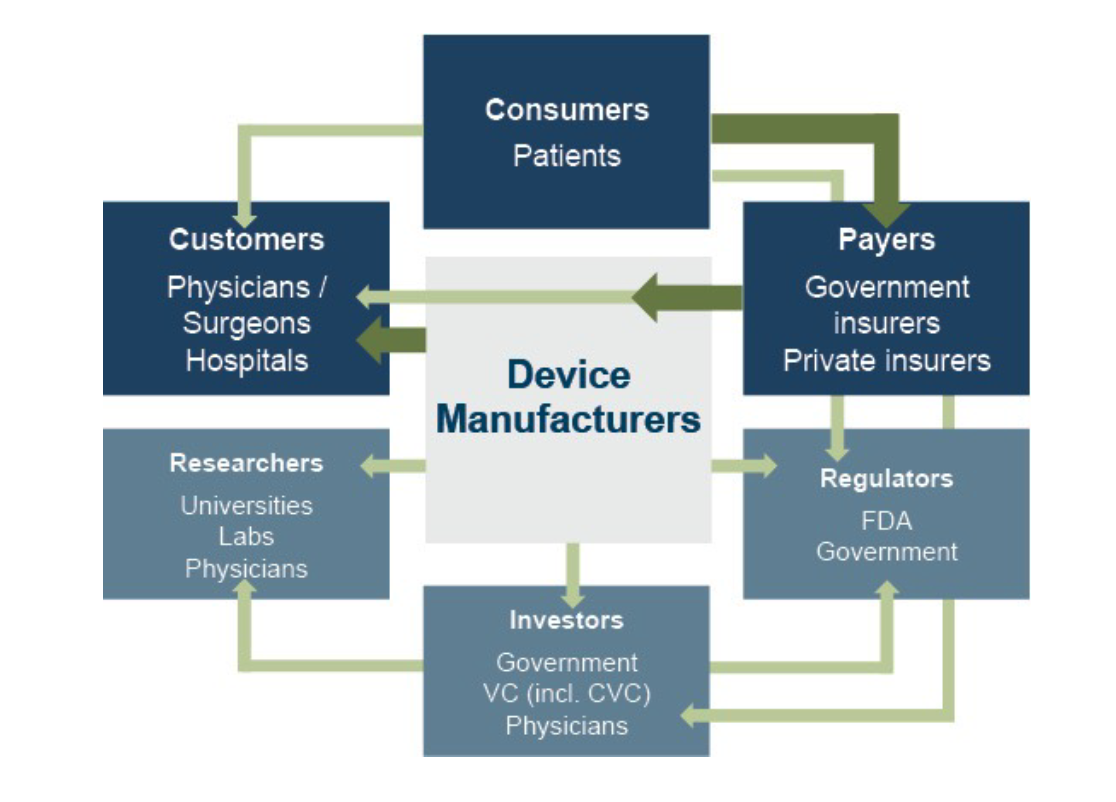 The primary customers of medical device companies are physicians (and/or product approval committees at their hospitals), who select the appropriate equipment for consumers (patients).In most developed economies, the consumers themselves are one (or more) step removed from interactions with manufacturers, and therefore pricing of medical devices.Device manufacturers ultimately receive payments from insurers, who usually reimburse healthcare providers for routine procedures (rather than for specific components like the devices used).Accordingly, medical device purchasing decisions tend to be largely disconnected from price.