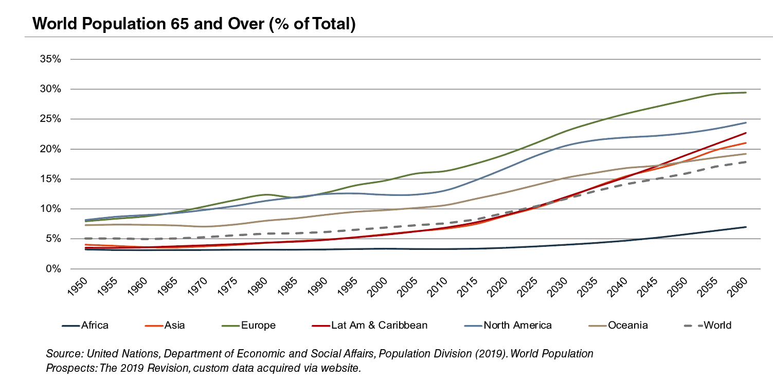 According to United Nations projections, the global elderly population will rise from approximately 608 million (8.2% of world population) in 2015 to 1.8 billion (17.8% of world population) in 2060.Europe’s elderly are projected to reach approximately 29% of the population by 2060, making it the world’s oldest region.While Latin America and Asia are currently relatively young, these regions are expected to undergo drastic transformations over the next several decades, with the elderly population expected to expand from approximately 8% in 2015 to more than 21% of the total population by 2060.