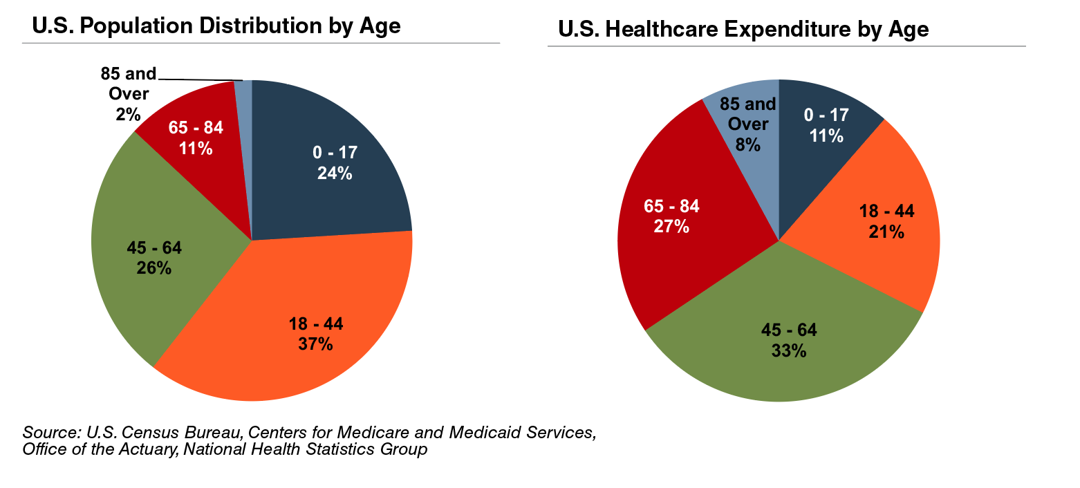 The elderly account for nearly one third of total healthcare consumption in the U.S.Personal healthcare spending for the population segment was approximately $19,000 per person in 2014, five times the spending per child (about $3,700) and almost triple the spending per working-age person (about $7,200).