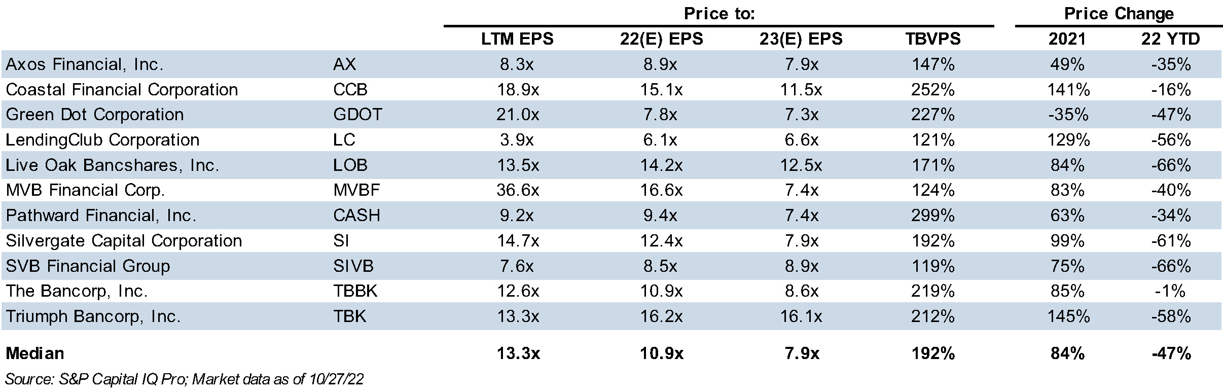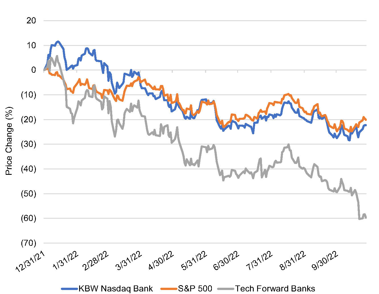 1 Tech-forward banks include AX, CCB, GDOT, LC, LOB, MVBF, CASH, SI, SIVB, TBBK, and TBK.Year-to-date performance through 10/27/22