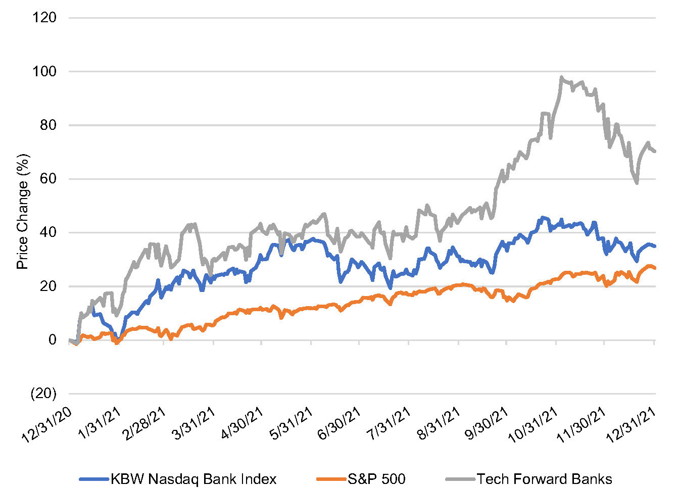In the year-to-date period, the KBW Nasdaq Bank Index has declined 22%, compared to a decline of 20% in the S&P 500 through October 27.Tech-forward banks have underperformed the broader banking sector, down 60% in the year-to-date period.1This is a reversal of the trend in 2021 when tech-forward banks outperformed the broader banking sector, logging a 70% increase compared to an increase of 35% in the KBW Nasdaq Bank Index.