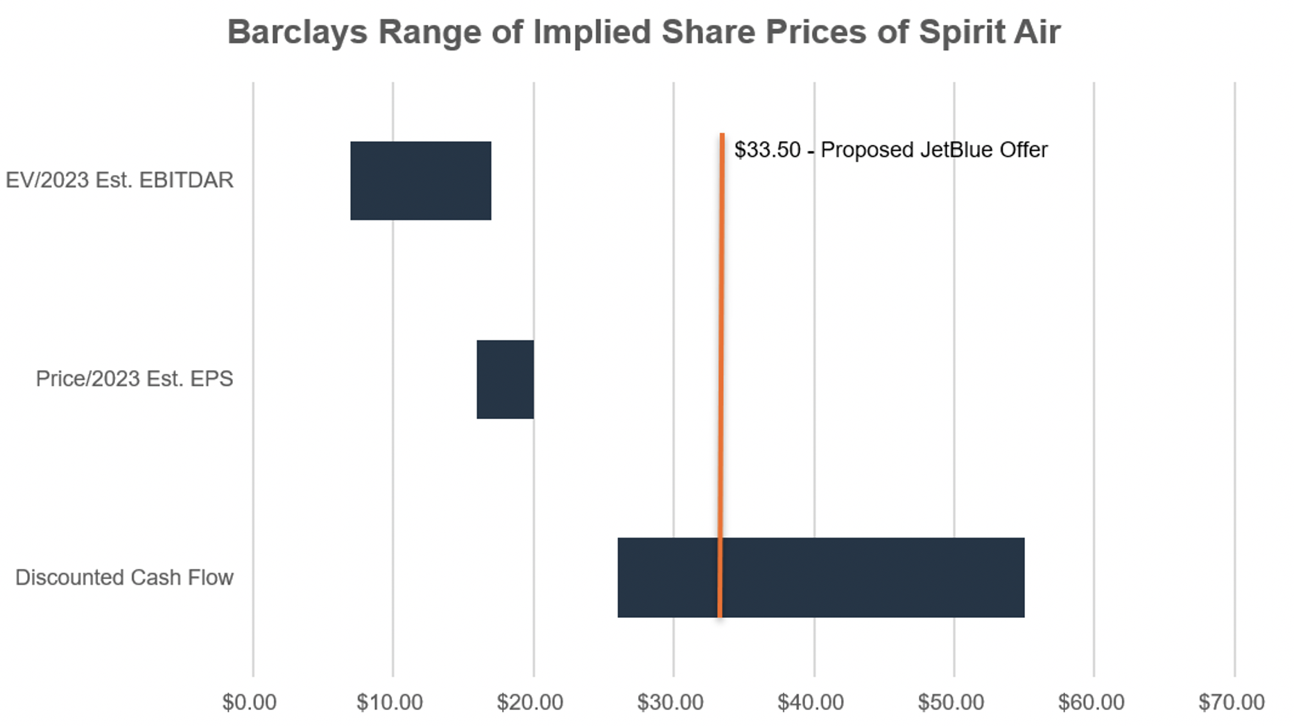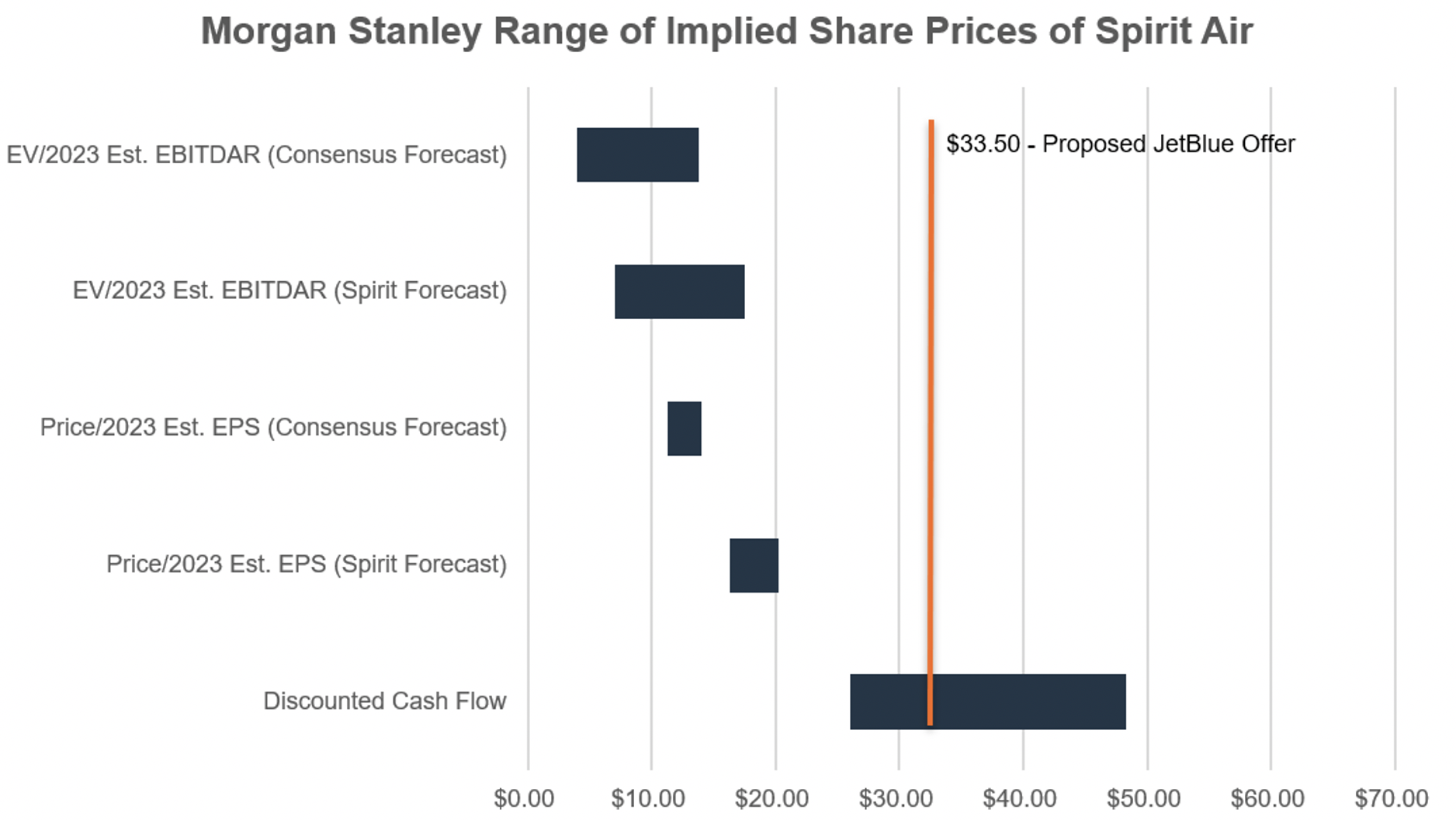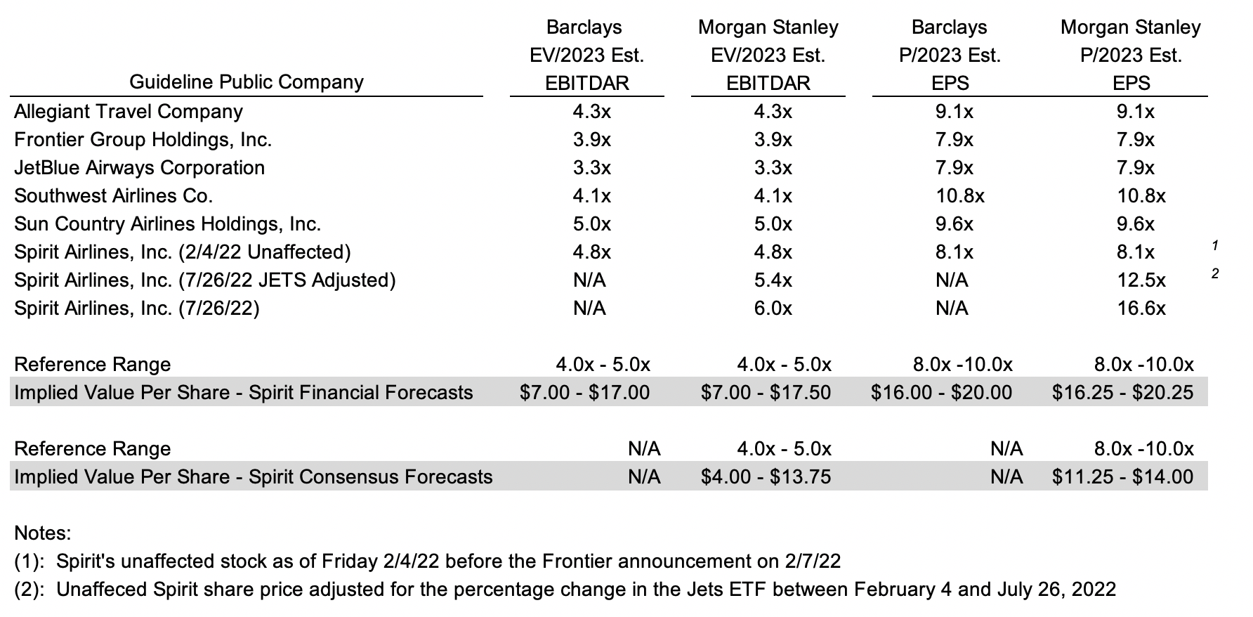 Both banks relied upon management's forecast for net income and EBITDAR; however, Morgan Stanley also considered the Street's consensus forecast for 2023. Spirit is included in the comp group to develop the applicable multiples with both banks relying upon pricing in early February immediately before the Frontier deal was announced; however, Morgan Stanley included alternate multiples based upon Spirit's price as of July 26 and as of July 26 based upon the change in the industry ETF (JETS) from February 4. Nonetheless, the indicated values each developed based upon management's forecast were the same.
