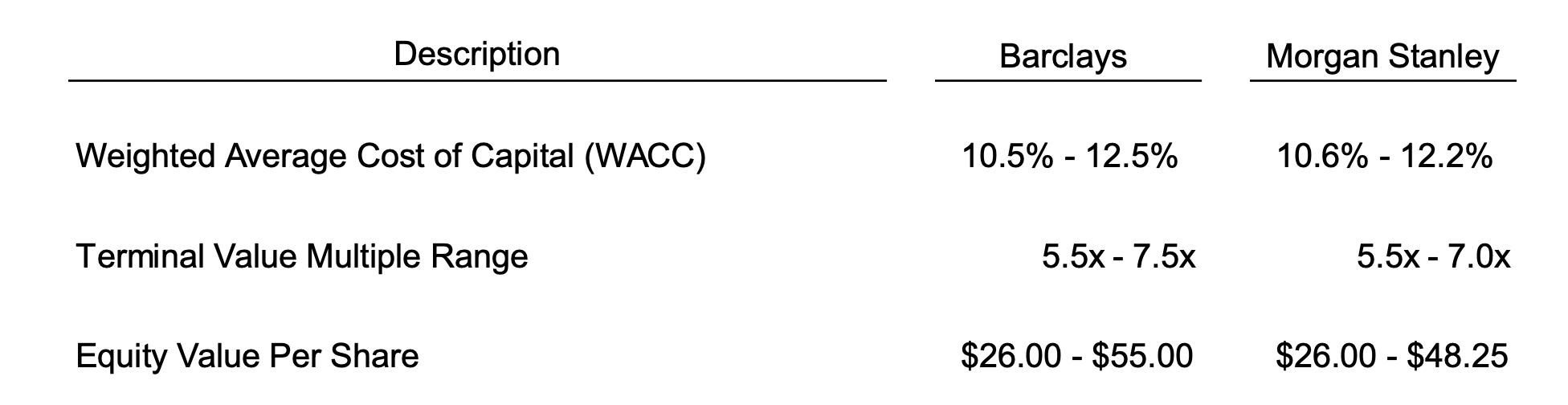 Both banks included a DCF analysis, a valuation method that is standard in virtually all valuation analyses. The gist of the analysis reflects the discounting of unlevered cash flows over a discrete period (2H22-2026) and the projected debt-free value of the company at the end of the projection period to present values based upon the weighted average cost of capital. Net debt is then subtracted to derive the indicated equity value.