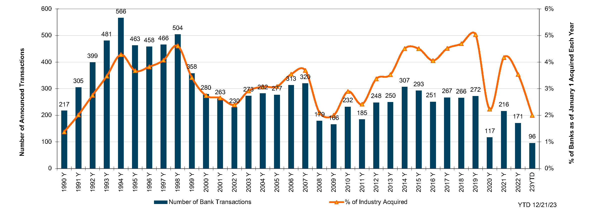 As of December 21, only 96 bank and thrift deals had been announced, which equated to about 2.0% of the number of charters as of January 1 – a level that is equivalent to the recession years of 1991 and 2009. The aggregate deal value for transactions that included disclosed pricing was only $4.6 billion, by far the lowest deal value since 1990 when an equivalent amount of non-assisted deals was announced. Adjusted for inflation, deal value was ~40% of 1990.