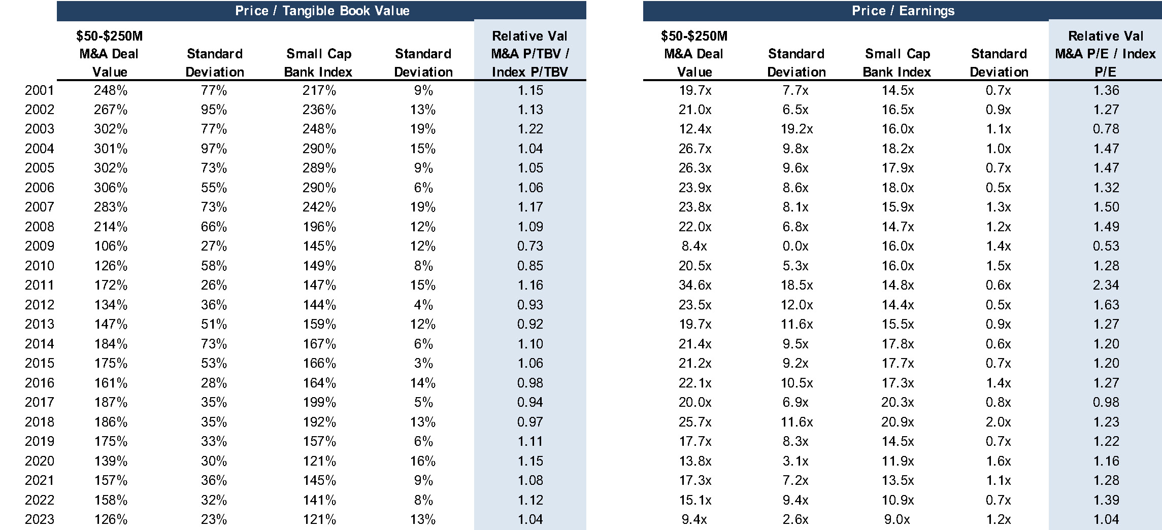 Figure 3 compares the annual average P/TBV and P/E for banks that were acquired for $50 million to $250 million since 2001 with the average daily public market multiple each year for the SNL Small Cap Bank Index. Among the takeaways are the following: