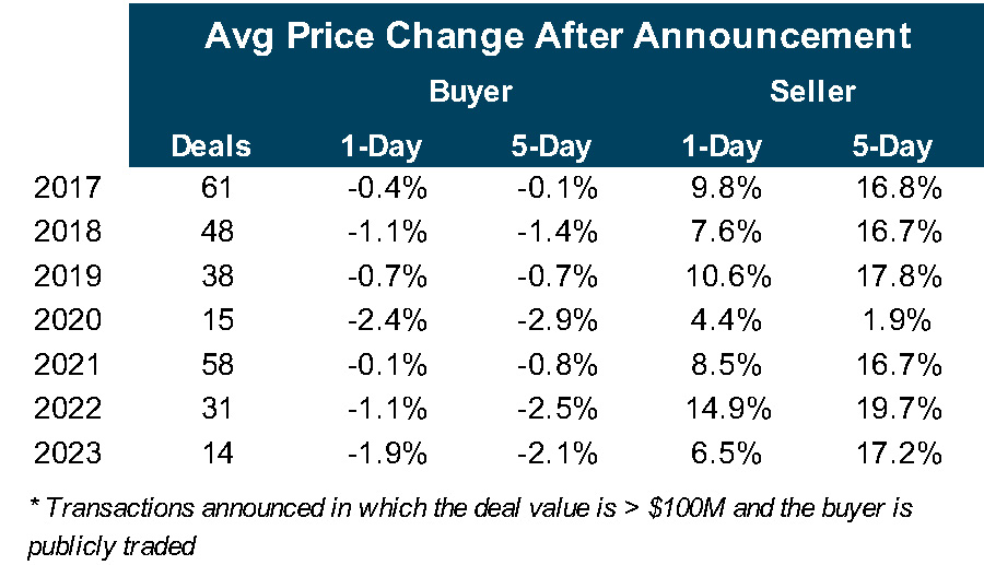 As shown in Figure 4, the average five-day premium for transactions announced in 2023 that exceeded $100 million in which the buyer and seller were publicly traded was about 17%, a level that is comparable to recent years other than 2020. For buyers, the average reduction in price compared to five days prior to announcement was 2.1%. There are exceptions, of course, when investors question the pricing (actually, the exchange ratio), day one dilution to TBVPS and earn-back period.