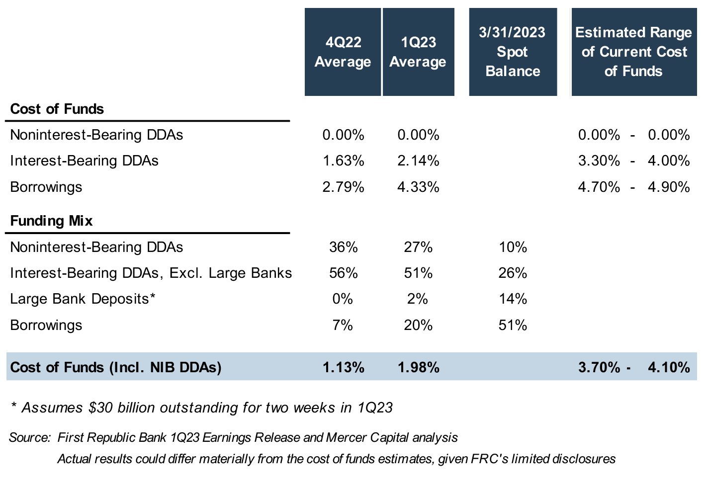 FRC did not disclose its post-run cost of funds, nor has the rate paid on the $30 billion deposited by large banks been disclosed to our knowledge. Using FRC’s paltry disclosures and our best estimates, the table on the right provides a rough approximation of FRC’s current cost of funds.We caution that, among other uncertainties, further contraction of noninterest-bearing deposits would cause even more funding cost pressure.