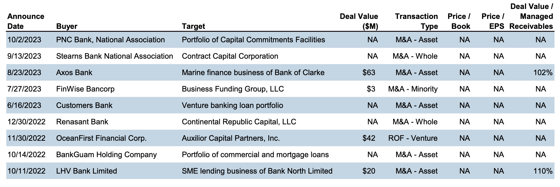 As shown in the table below, there have been only five specialty finance deals involving a bank buyer announced since the beginning of the year compared to 13 in 2022 when rising rates sidetracked deal activity during the second half of the year. Prior to 2022 excluding 2020, a typical year would entail banks acquiring 20+ specialty finance companies per year according to S&P Global Market Intelligence.