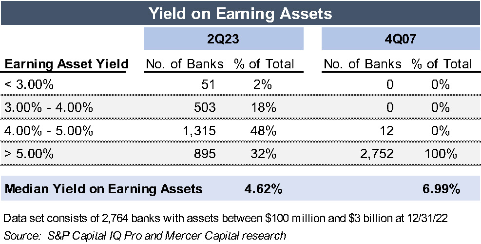 Deposit rates presumably will grind higher, and an extrapolation of recent deposit cost changes suggests that the median cost of interest-bearing deposits will reach 2.00% to 2.50% from 1.59% in the second quarter of 2023. Nevertheless, deposits cost for most banks likely will remain well below the level reported in 2006 and 2007. This is desirable for several reasons, but most importantly because earning asset yields are well below the level reported in 2006 and 2007. In the fourth quarter of 2007, the median yield on earning assets was 6.99%, which is 237 basis points higher than in the second quarter of 2023 (per Figure 4). From an investment standpoint, current conditions somewhat mirror the late 1970s when most thrifts and some banks were caught with long(er) duration assets as funding costs rose. We believe the “asset duration issue” has weighed on bank stocks this year though institutional investors’ focus may now be shifting to credit risks.