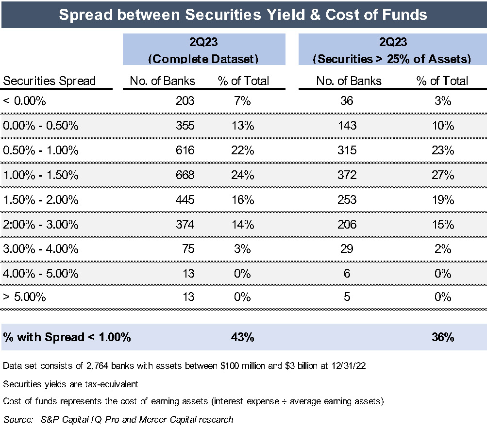 The number of banks with low or negative securities portfolio spreads has steadily increased. The proportion of banks with spreads of less than 1% increased from 8% in the fourth quarter of 2019 to 36% in the fourth quarter of 2022 to 43% in the second quarter of 2023. Similarly, banks with negative spreads increased from 2% in the fourth quarter of 2019 to 3% in the fourth quarter of 2022 to 7% in the second quarter of 2023.
