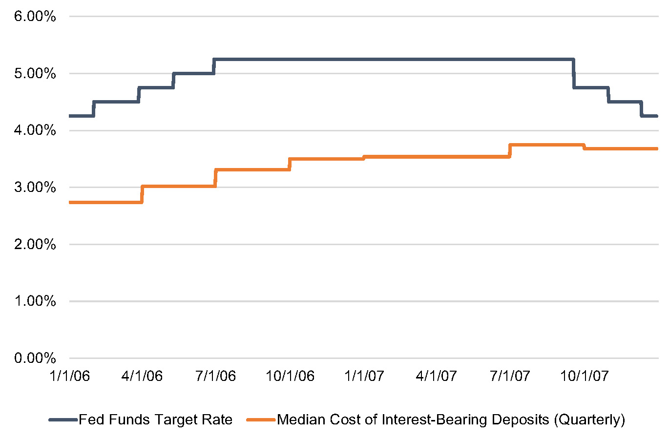 The most recent period in which the Fed Funds target rate exceeded 5% occurred from 2006 to 2007. As shown in Figure 2, the median cost of interest-bearing deposits for the same group of banks included in Figure 1 reached 3.75% in the third quarter of 2007. For the second quarter of 2023, however, this group’s cost of interest-bearing deposits was only 1.59% (see Figure 3).