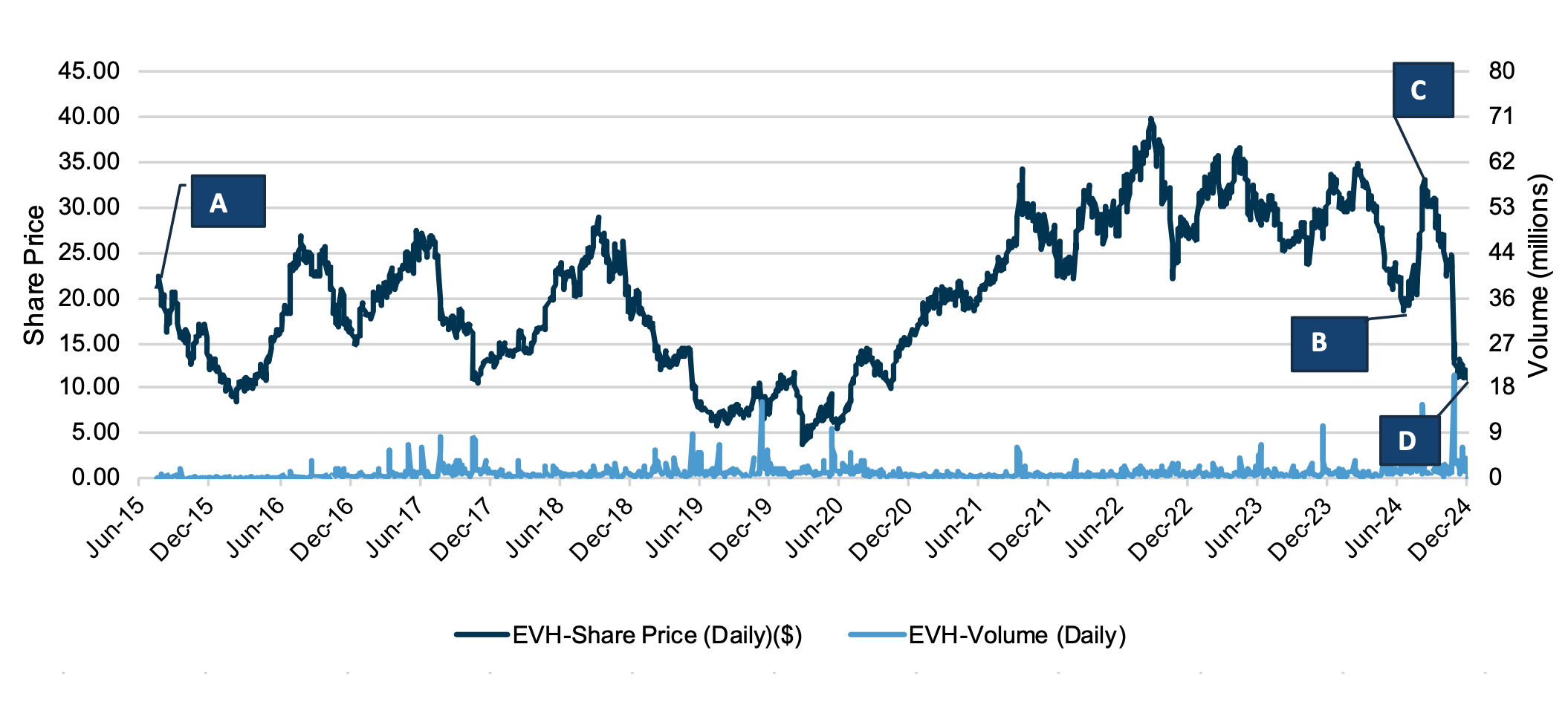 (B): EVH’s stock price fell approximately 42% from $32.79 per share at 1Q24-end to $19.12 per share at 2Q24-end, even as the Company reported first quarter revenue that beat expectations and adjusted EBITDA in line with prior guidance.The decline in price likely reflected risks around higher costs due to increased utilization in certain specialties, as well as general uncertainty due to an industry-wide disruption caused by a ransomware cyberattack on a large revenue cycle management company.3