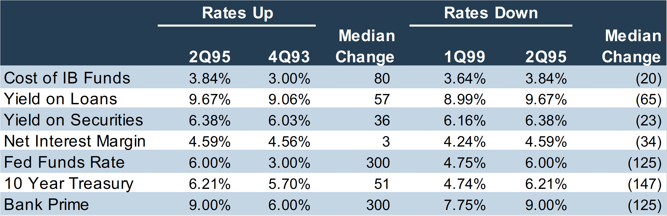 The next figure provides a look at the change in the COF, yields and NIMs during the up rate cycle of 1994 and subsequent down rate cycle of 2Q95 to 1Q99. Although the Fed hiked its policy rates 300bps in a little over 12 months and thereby produced a ferocious bond bear market in 1994, bank fundamentals remained solid given a backdrop of a growing economy and stable real estate values. The median change in the COF was 80bps while the median yield on loans increased 57bps. However, the delta between bank prime rate and yield on loans tightened from 4Q93 (~300bps) to 2Q95 (~70bps). Net interest margin was approximately flat between time periods.