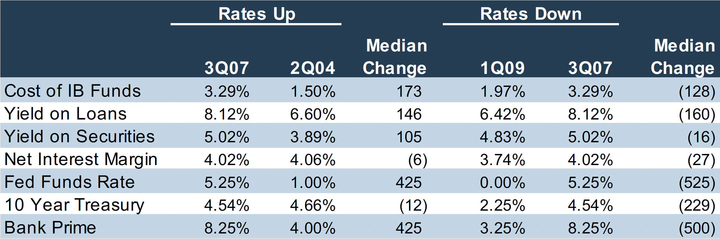 Now that the pandemic interest rate cycle is complete (rate cuts in 2020, rate hikes in 2022-2023) and a new “downrate” cycle has begun. We take a high-level look at changes in yields, cost of funds (COF) and net interest margins (NIM) from past cycles to gauge how he unfolding downrate cycle may impact margins.