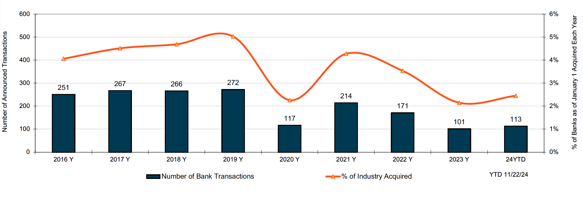 The Nasdaq Bank Index increased by 31% between June 30, 2024 and November 22, 2024. Buyers have stronger currencies for deals; even if the seller receives the same number of the buyer’s shares as they would have received in 2022 or 2023, the nominal deal value will be higher after the election.