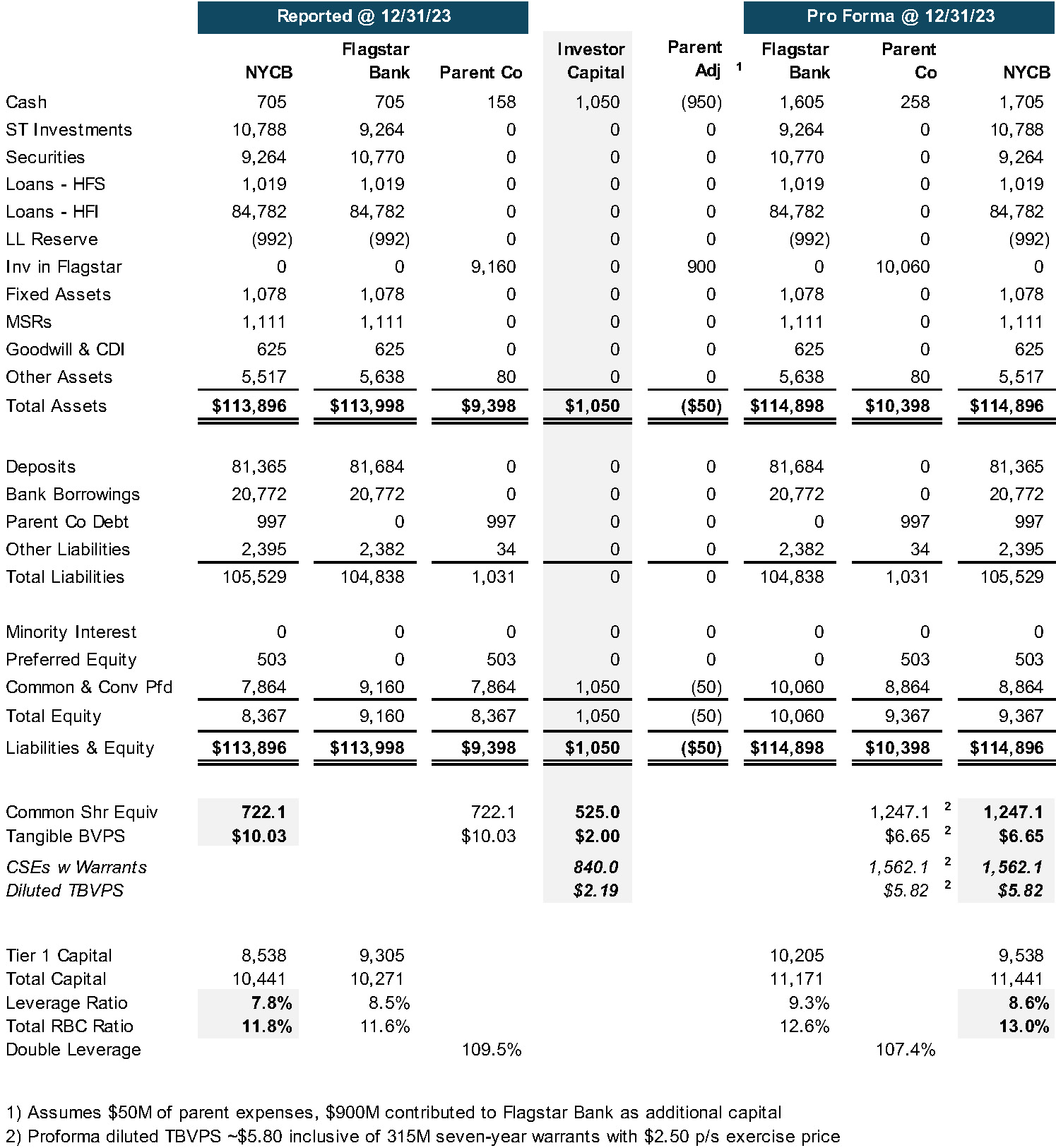 The figure on the right presents our proforma analysis of the transaction and its impact on the consolidated company (NYCB), the parent company in which the group invested, and wholly owned Flagstar Bank, N.A. The adage that capital is exorbitantly expensive if available at all when it must be raised comes to mind here with NYCB.