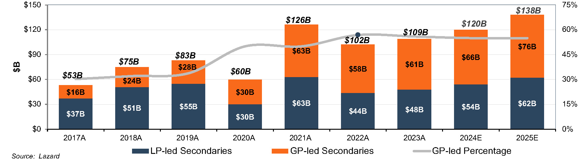 Subdued M&A and IPO markets since mid-2022 have spurred growth for private equity secondaries, which mostly consists of GP-initiated transactions for continuation funds and LP-initiated transactions for portfolio interests.
