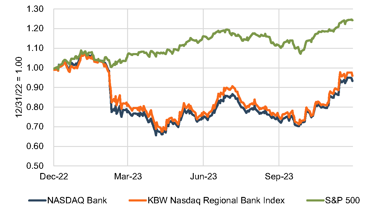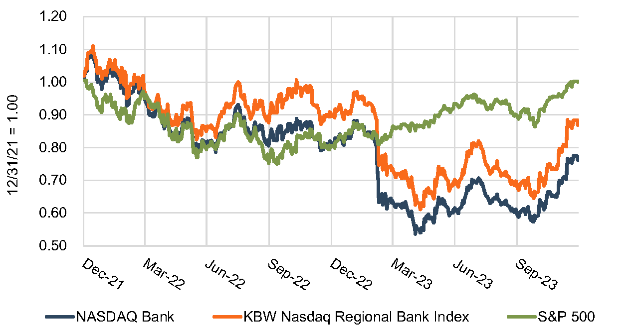 For 2023, the Nasdaq Bank Index and the KBWNasdaq Regional Bank Index depreciated by 7% and 4%, respectively (see Figure 1 ). This marks the second year of negative performance for bank stock indices. Between year-end 2021 and 2023—covering the entire period of rising rates—the Nasdaq Bank and Regional Bank indices decreased by 24% and 13%, respectively (see Figure 2).