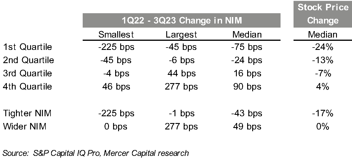 The first quartile, including banks with the most severe NIM pressure, experienced a median stock price change of negative 14% in 2023. Meanwhile, banks in the fourth quartile—with the least NIM pressure or even NIM expansion—eked out a positive 2% change in stock price.